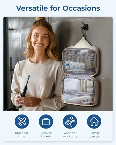 Travel Convenience: This toiletry bag boasts a 360° swivel hook for easy hanging in any setting, including bathrooms and gym lockers. Made with water-resistant fabric, it protects your essentials from moisture. The robust side handle enhances portability, making it ideal for travelers.